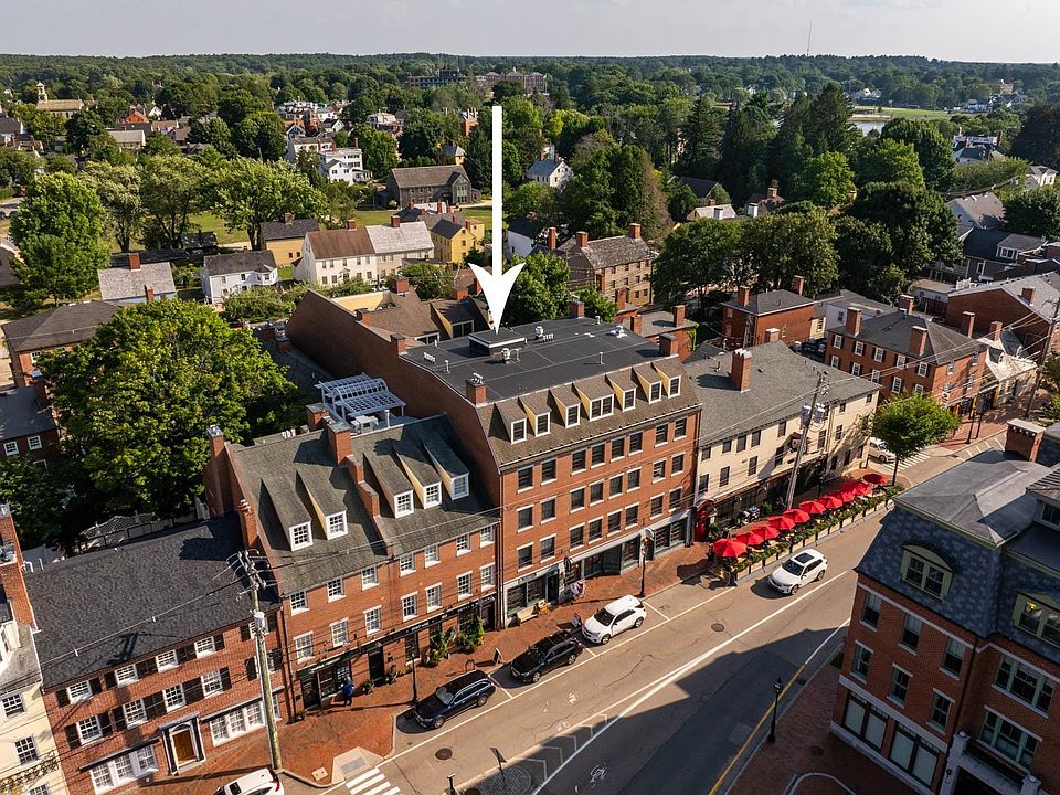 Experience penthouse living in historic downtown Portsmouth, where luxury meets urban sophistication. From your front door grab coffee & a stroll to waterfront Prescott Park, immersing yourself in the vibrant atmosphere. At day’s end, retreat to your private deck to relax among treetop views, enjoying front-row seats for the July 4th fireworks. This expansive one-level unit features direct, secure elevator access & exquisite finishes, including raised paneling, double crown molding, grass cloth wall coverings, California Closet systems, & hardwood floors throughout. The formal living room, adorned with a gas fireplace, flows into the dining area with a built-in sideboard, perfect for intimate dinners or gatherings—even for a baby grand piano. The sun-drenched kitchen, equipped with high-end appliances, granite countertops, & a spacious island, is a chef’s dream. The primary bedroom suite is a tranquil sanctuary with river & bridge views, boasting a newly renovated bath featuring marble flooring, glass-enclosed shower, & quartz counters. Additional highlights include two heated garage spaces, EV charger wiring in this non-smoking, pet-friendly building. Enjoy nearby dog parks, public tennis/pickleball courts, & playgrounds. Explore award-winning restaurants, galleries, shopping, & venues like Strawbery Banke, along with seasonal events at Prescott Park. Live the Portsmouth lifestyle in this exceptional penthouse, where luxury meets history, & every day feels like a getaway.