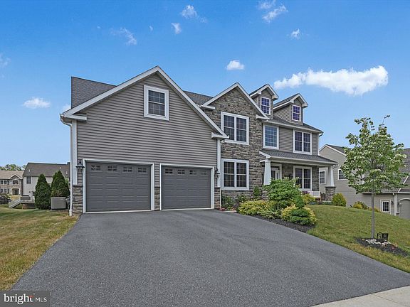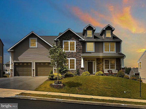 Gorgeous and grand — this recently built 2-story stone and vinyl home is set in the highly-desired Green Valley West neighborhood in the Wilson School District featuring high ceilings, an open floor plan, and thoughtful amenities. Stunning from first sight, this 5 bedroom, 3.5 bath Arlington/England II design is ready for entertaining and accommodating multiple guests. A stone facade and thoughtful landscaping welcome you as you step onto the front porch. Upon entering, immediately notice the custom lighting and tray ceilings in the formal dining room. Off the foyer is a spacious, private office with French doors. Walk further and immerse yourself in the large, open living room adorned with tile wood flooring, a gas fireplace and large vertical windows. Glance over at the immense kitchen to see the soul and center of this magnificent home. Custom Old Mill cabinets reaching to 9 foot ceilings, two large bronze globe pendant lights, and a stainless steel commercial double-oven range and vented hood create a chef’s dream workspace. The centerpiece of the room is the abundant contrasting island with a full solid slab of Kashmir white granite (and ample underneath storage!) that will take your breath away. Seating for four, a microwave drawer, a warming drawer and quiet-close drawers are only some of the thoughtful additions. Function and beauty combine to make entertaining, family gatherings, and everyday living truly easier. Enjoy breakfast with sunshine streaming through the windows of the sunroom or dine al fresco on the patio just steps away. A first-floor en-suite with two windows, a large closet and a private bathroom is conveniently located off the living room and perfect for guests. The second floor double-access stairway leads you up to a catwalk overlooking the foyer and downstairs living space. Second floor conveniences include 3 additional bedrooms with large closets, a full bathroom and a large laundry room off the primary bedroom. Double doors welcome you to the large primary suite providing gorgeous natural light, a vaulted ceiling, a sitting room and a walk-in closet. Relax and unwind in the primary bath boasting a porecelain-enameled cast iron soaking tub and a huge glass shower with a granite bench and dual showerheads. The expansive basement is ready to make your own with high ceilings, newer utilities and plumbing ready for a full bathroom. Windows provide great natural light and the walk out double doors give access to the yard. This home is equipped with everything your family needs to entertain and thrive. Its ideal location is a short walk to Green Valley pool/country club, Wilson West middle school, Green Valley Elementary and nature sanctuaries. Restaurants, shopping and the Blue Marsh lake are only a short drive. If you desire maintenance-free living, abundant upgrades and have a love for entertaining multiple guests, this home is for you!