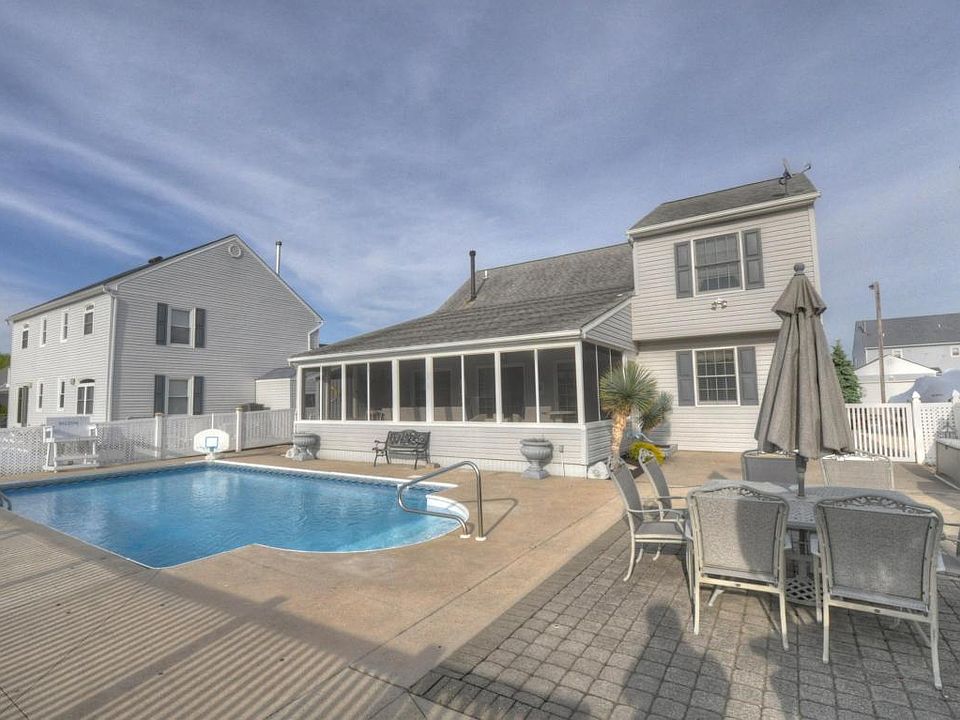 Five bedrooms, including one on the first floor. 14 x 28 heated in-ground pool and 27x14 screen in porch. Open kitchen with granite counters, quality cabinets, stainless appliances, center island and five burner gas range. Ceramic floors 1st floor along with central vacuum and full security system. Multi zone gas HWBB and central AC, Two full baths plus an outside shower and almost 1,800 sq. ft. of living space. 60 ft. on the water. Low maintenance landscaping (no grass to cut!).