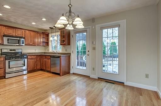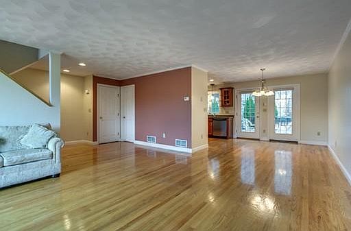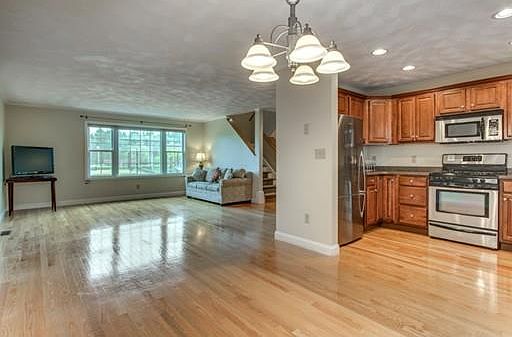 Ideally situated with bright sunshine streaming in!! Nine years young, this townhouse offers three finished levels. A galley kitchen has an oak floor, cherry cabinets, granite counters and opens into the dining room for convenience. Two French doors lead to the rear deck. The living room has crown moulding an oak floor and great windows. There is also a full bath on this level. Three bedrooms and a full bath are on the second level. A pull down stairway gives access to a great storage area. The lower level has a finished family room with a gas fireplace, warm wall to wall carpeting, a laundry room and a half bath. The location allows an easy walk to either the Oak Grove subway, the commuter train to Boston and fabulous Downtown Melrose with all its great restaurants.