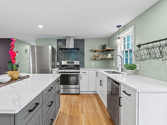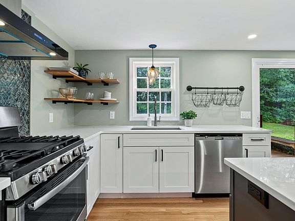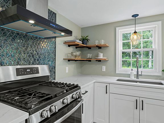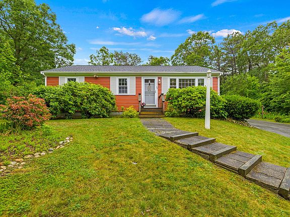 Tucked into the end of a quiet street, surrounded by conservation land, is 66 Tracy Lane. This first floor living ranch style home is welcoming with a newly renovated kitchen boasting open flow space into the living room and dining area. A large center island, quartz countertops, stainless steel appliances and floating shelves creating a modern feel and efficient space for creating meals and enjoying gatherings. Wonderful transition to outdoor living with a wood deck and paved patio right outside the kitchen through a slider door. Hardwood floors throughout give a clean and crisp feel. The main renovated bathroom is equipped with a barn door entrance, custom walk in shower, stackable wash & dryer and linen cabinet. The primary bedroom has a deep closet and renovated half bath. There are an additional 2 bedrooms completing the easy flow living. This home offers a new on demand hot water heater, central a/c, leased solar panels and hook up for an electric car. The location is close to Ockway Bay, South Cape Beach, Mashpee Commons, Conservation Trails and Popponesett Village. Three bedroom passing title v in hand.