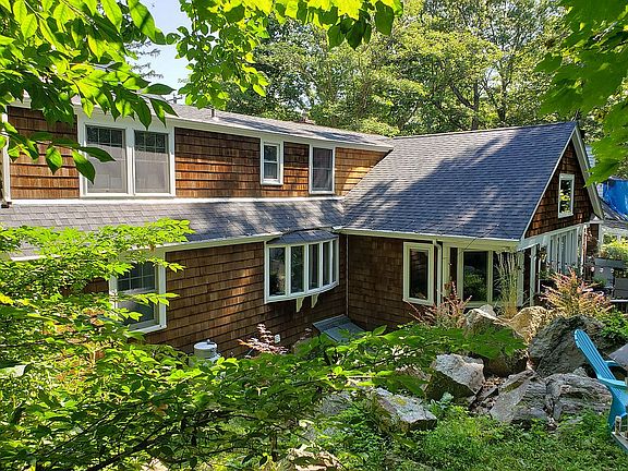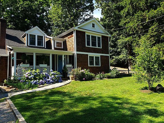A covered front porch w/ comfortable wicker furniture invites you home to the expanded 4 (5) bedroom shake Colonial on park-like .39 acre w/ rock garden beds creating a retreat to roast Smores around the fire pit. The 25 x 12 vaulted ceiling kitchen has a bright corner dining area that opens 18 x 17 Family Room with soaring exposed beam ceiling, fieldstone fireplace & French doors opening to the deck overlooking the sweeping lawn.. A first floor bedroom has access to a full bath plus a home office/den/5th bedroom option. A sweeping entry flows into the living room with 2nd fireplace & formal dining room. Upstairs are 3 bedrooms including a Master w/ double walk-in closets. lower level recreation room offers an approx. 800 additional SQ FT. Newer roof & newer furnace