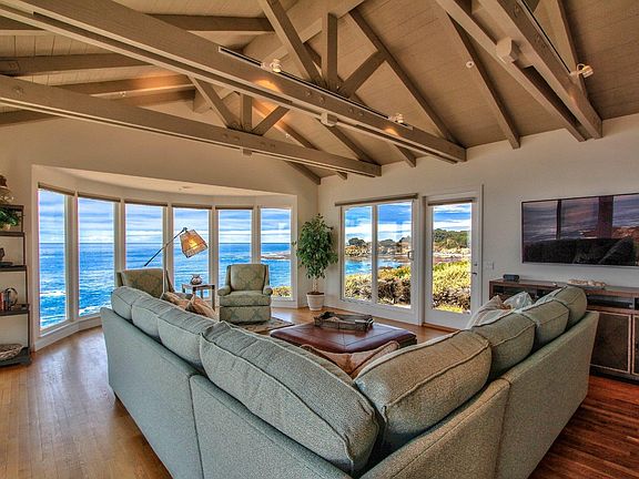 Perched on the rocky cliffs of the Carmel Highlands just south of Point Lobos, this four bedroom, four and one half bath home overlooks crashing waves and picture perfect sunsets. Built in 1998, this home was designed to take advantage of the phenomenal ocean views from nearly every room in the house. The living room and family room walls on the west side of the house are nearly all glass, providing 180-degree views of the coastline and the Pacific. Vaulted ceilings, remote controlled electric blinds, hardwood floors, two fireplaces, dual zone heating and high-end appliances complete the luxury experience. This property was furnished with beds, linens, kitchenware and large wall mounted televisions less than two years ago, all of which are available to be purchased with the property. Enjoy true oceanfront living in a modern home.