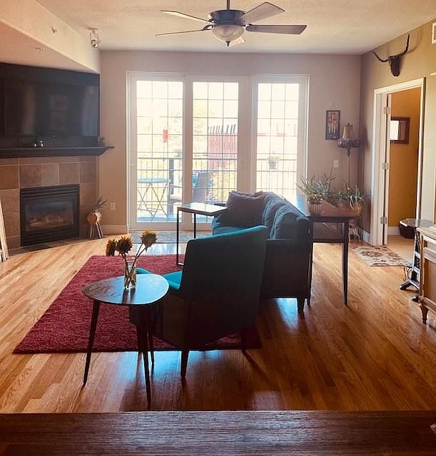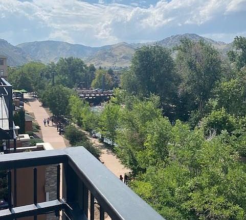 Fabulous third floor end unit, overlooking Clear Creek, the Foothills, and Parfet Park. Large balcony directly over the creek. Sunrise and sunsets from balcony. Great floor plan, granite counters, stainless steel appliances, hardwood floors, plantation shutters, ceiling fans. Spacious closets in each bedroom. Fireplace, garden bathtub in master. Garage parking with large storage unit. Downtown Golden living, walk to restaurants, shops, retail, parks, trailheads. Secure building. Owner covers water and Internet. Renter pays electric, cable. No smoking, no pets please. Free underground parking spot and additional spots in front with permit.
