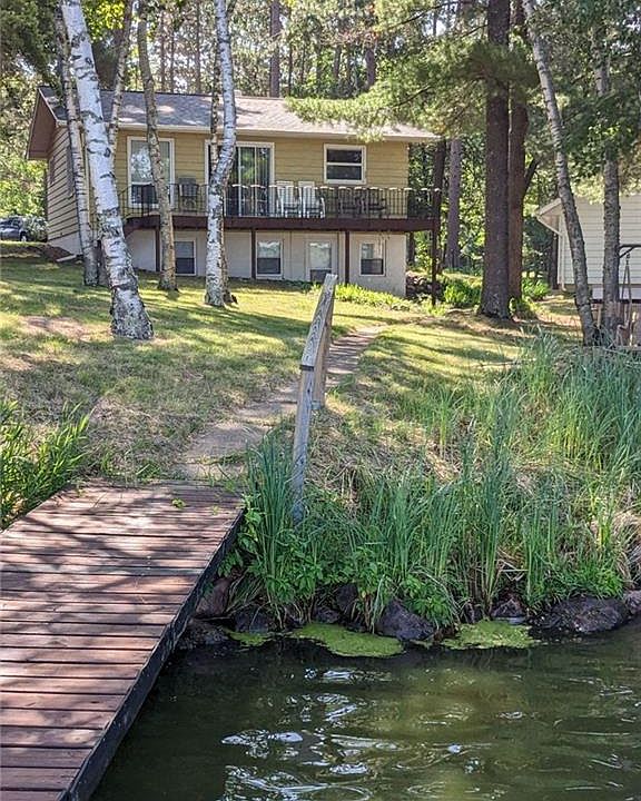 Lakefront beauty on the Chetek Chain of Lakes! This well-maintained home has 110' of frontage on Tenmile Lake. Beautiful half-acre lot with many mature trees in both front and lakeside green spaces. The lot is on a small peninsula and there is lake surrounding the lot for a panoramic west-facing view! This frontage is nice and even with lake: no stair steps required! There is a 25' deck facing the lake from the main floor with another patio and fire-pit area close to the lake. Space has been superbly utilized inside with nearly all square-footage finished. 3 bedrooms; one in lower, walk-out level with an en-suite full bathroom and huge 7 x 4 foot walk-in closet - all behind french doors for privacy. There is also a small family room in the lower level that is currently being used for an additional bed for sleeping. Let's not forget the HUGE 2.5 car garage with extra 10.5 feet of depth for extra storage or workshop. Many furnishings included for a turn-key, lake-front dream!