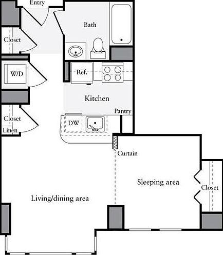 This open penthouse studio has 1 full bathroom and features a completely open layout with the kitchen open to the living area. Virtual tour available. Can send to you by request, just like seeing the apartment.