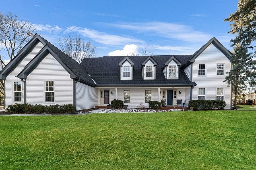 Fabulous & spacious Cape Cod with interior lot and prime cul-de-sac location in Flint Creek neighborhood! Meticulous and beautifully updated home offers 4/5 Bedrooms + Den and 3.1 Bathrooms (over 5,000 SF) and a long list of improvements! A covered porch leads you to a welcoming two-story foyer with a curved staircase and large formal Living Room and Dining Room featuring hardwood flooring and crown molding. The Kitchen will take your breath away with an 11 ft. center island, timeless alder cabinetry offering loads of storage, a built-in buffet cabinet, granite counters, stainless appliances, walk-in pantry and a huge sun-drenched eating area. The adjacent laundry/mud room offers convenient storage cubbies, additional cabinetry, a service door and direct entry to the 3-car garage with epoxy floor & attic storage. The Family Room includes a wood burning fireplace and updated built-in bar with quartz countertops. The Den could serve as a WFH option, Sunroom or a first floor Play Room. The bluestone & paver patio is another great highlight and provides perfect outdoor living with separate seating and dining spaces plus space for a firepit and two natural gas hookups for multiple grilling stations. The upper level boasts a grand Primary Suite with vaulted ceiling, a sitting room, large walk-in closet and gorgeous renovated bathroom with a soaking tub, a glass shower, oversized vanity with double sinks, heated floors and water closet. There are three additional generously sized bedrooms with great closet space and an updated full bathroom. A true full basement is rare and this one has it all, including a large REC Room, 5th Bedroom, full bathroom, wet bar / 2nd kitchen and storage room. Desirable Flint Creek subdivision offers regular neighborhood events, proximity to Citizen's Park, Cuba Marsh walking/biking trails, Barrington Library, downtown Barrington shopping & dining, Metra train and award-winning District 220 Schools. Significant improvement include: Roof, siding, gutters & facia; 3 Anderson retractable storm doors (2024); Patio, driveway (2024); water heater & ejector pump (2021); plus irrigation system, invisible pet fence, epoxy garage floor, Pella windows and much more to appreciate in this fantastic home!