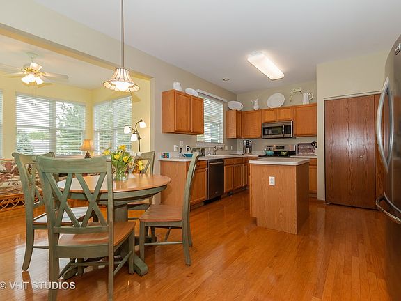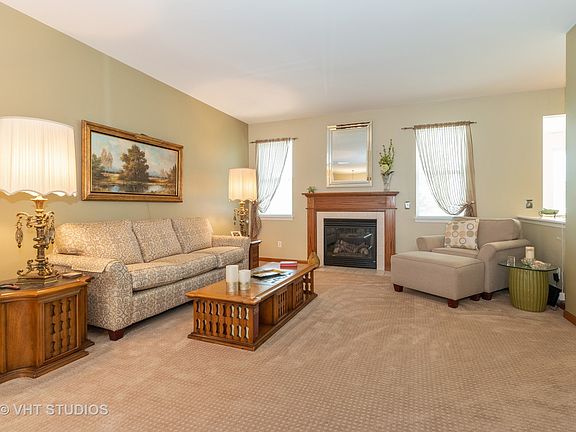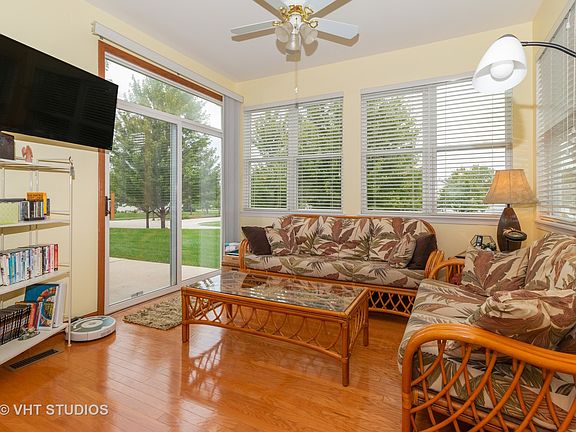 Seldom available Fountain Point model for sale in the highly regarded Grand Haven community for active 55+ adults! This elegant townhome features the largest floor plan with 9' ceilings and is priced to sell. Meticulously cared for & beautifully updated w/ stainless steel kitchen appliances, oak cabinets, wood floors and upgraded carpet. Entertaining or relaxing, this home delivers versatility. The oversized Living Room and adjacent Dining Room is great for a group or reading alone next to the fireplace. The eat-in kitchen leading into the Sunroom and outdoor double patio is perfect for a party or quietly enjoying a sunset above the tree lined yard. It lives like a single family home! Attached 2-car garage includes additional attic storage space. Community features a clubhouse with indoor & outdoor pools, tennis courts, fitness center, walking path, ballroom, salon, arts & crafts room and more. Golf course just blocks away. Convenient location; just minutes from shopping & expressways.