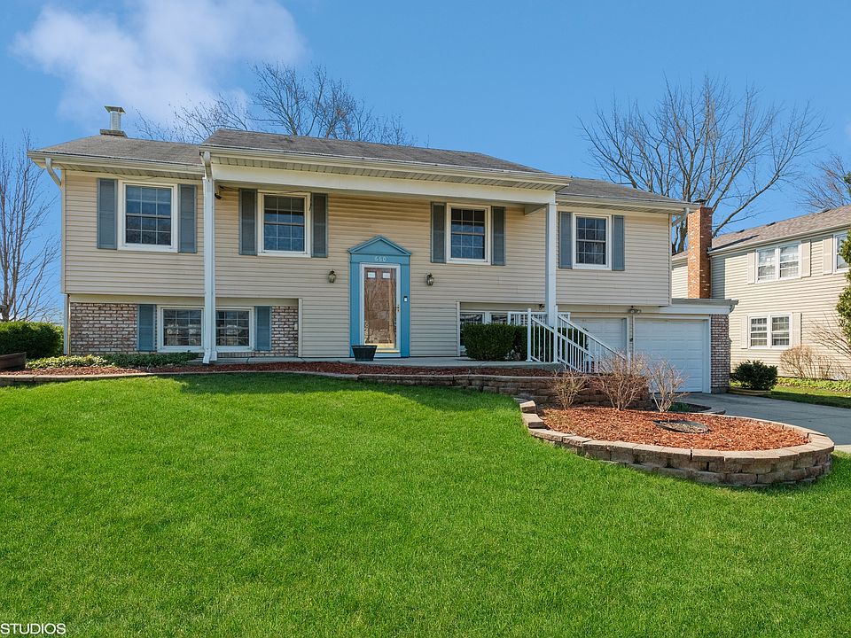 Welcome to this inviting Nottingham model in the sought-after Strathmore neighborhood! This 4-bedroom, 3-bathroom home boasts an updated exterior with a covered front porch, new cement walk and stairs, professional landscaping, and a maintenance free custom multi-level Trex deck overlooks Willow Stream Park with sweeping views. The split-level floor plan features plenty of natural light, and is perfect for entertaining. The kitchen is a chef's dream, with new appliances, plenty of cabinets, an eat-in island bar with additional seating, and easy pull-out drawers. An open living and dining room flow seamlessly onto the new deck, perfect for summer barbecues and gatherings with friends and family. The deck overlooks the spacious and fully-fenced yard, making it ideal for kids and pets to play. Upstairs, the hallway leads to three generously sized bedrooms, including the large master suite with two additional windows and an updated private bath with a step-in shower. Downstairs, you'll find a large family room with cozy wood-burning brick fireplace, perfect for snuggling up on chilly nights, as well as a fourth bedroom and full hall bath, a perfect set up for a home office or teenager's room. The laundry area also features a window and new washer and dryer. An attached oversize 2 plus size garage is 20 x 24 and has extra cabinets for even more storage space, plus access to a convenient exterior door to the gated dog run. This home has been updated with a 2023 Carrier Payne furnace/AC, new high-end sliding glass door, and updated bathrooms, making it perfectly ready for your own finishing touches. This desirable neighborhood is close to shopping, schools, parks, restaurants, a fitness center, and more. You'll be within walking distance to the highly-acclaimed Willow Grove Kindergarten Center, Ivy Hall Elementary School, and Adlai E. Stevenson HS, the 54 acre park features a pool, tennis court, frisbee golf, and basketball right in your backyard, you'll never run out of things to do! Don't miss this opportunity to own an impressive home in the award-winning school districts 96 and 125. Schedule a showing today and fall in love with this beautiful and spacious home!