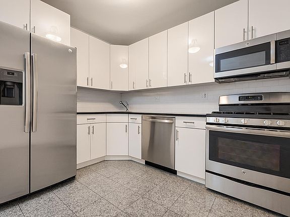 High-end white lacquer cabinetsGreat lightEnormous prewar sized bedroomsHanging microwaveReal slab granite countertopsWall-to-wall granite tiled bathroom