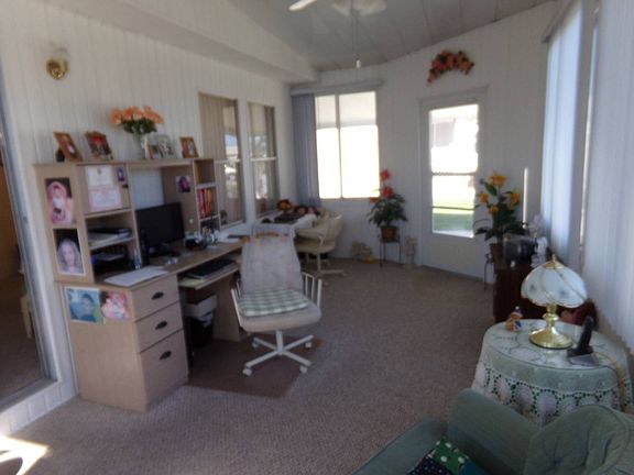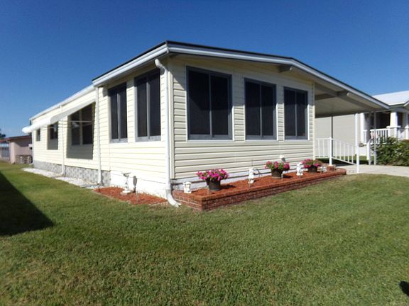 A lovely "turn key" double wide with newer vinyl siding, as well as sliding acrylic windows in the enclosed sunroom. Laminate flooring and a two year refrigerator are several of the kitchen features. In 2014 a new central A/C unit was installed and has a ten year warranty. Newer Berber carpeting is in the living, dining, hallway and bedroom areas. The enclosed sunroom, off the living area, is furnished, has a stand alone A/C unit, and provides a view of the neighborhood. A formal dining area has a full wall built-in china cabinet. Both bedrooms have full wall closets, and the master also has his/her closets, a built-in dresser, as well as an en-suite. A screened lanai, off the carport, has a storage shed that houses the washer/dryer, a hot water heater, a freezer and provides ample storage. The metal roof has been recently sealed and in 2017 new tie-downs were installed. Located in the age qualified community of Colony Cove. The home is mere steps from a pool, shuffle board court and recreation hall, with a library and kitchen. Lot rent is $753. This move-in ready home is priced to sell.