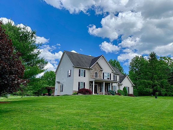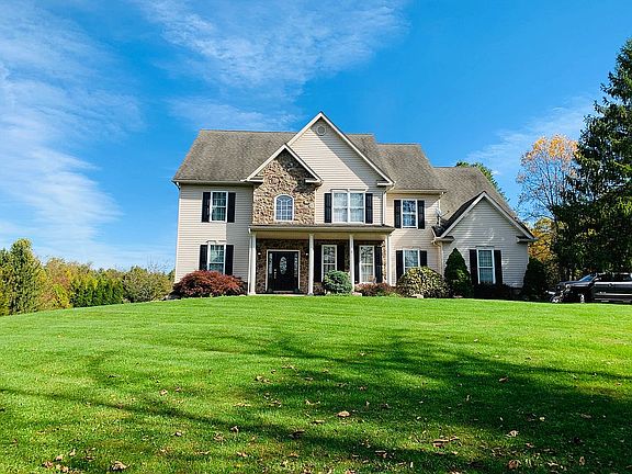 Beautiful home is a private, rural, secluded paradise! This 4,100 sq ft 4 bedroom, 3 bath home is situated on 3.49 acres featuring farmland and woodland views. Enter into the graciously appointed 2 story foyer with a large office to the left. The Formal dining room boasts of cherry hardwood floors, chair rail, crown moldings and a tray ceiling. Open floor plan highlighted by a oversized eat-in kitchen with stone flooring, stainless steel appliances, tons of cabinet space and a large island. Living room flows off the kitchen and has 18 ft high ceilings with stone fireplace. Host guests outside on large Flagstone patio with large wooden Pergola with canopy and beautiful stone fountain. The second floor has 4 large bedrooms and 2 full baths upstairs featuring a spacious master’s suite with walk-in closet, master's bath with double vanity, tub and shower. The expansive basement is finished on one side with storage on the other and French doors to the outside. Oil heat, central air, and all appliances stay. The side entry to oversized 3-car attached garage is just one more perk for this home. The home is wired for a generator, is close Nolde forest and Maple Grove Raceway. Plenty of room for horses! Come and see it today!
