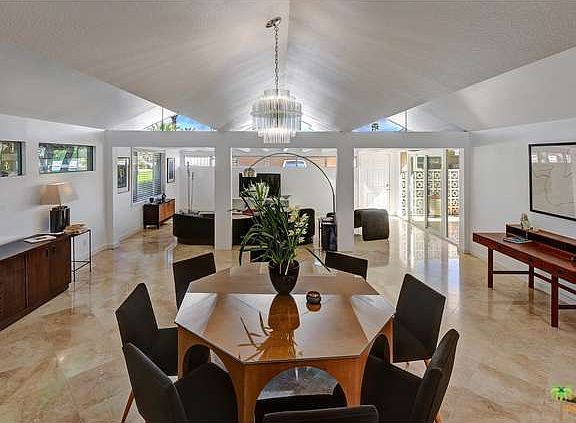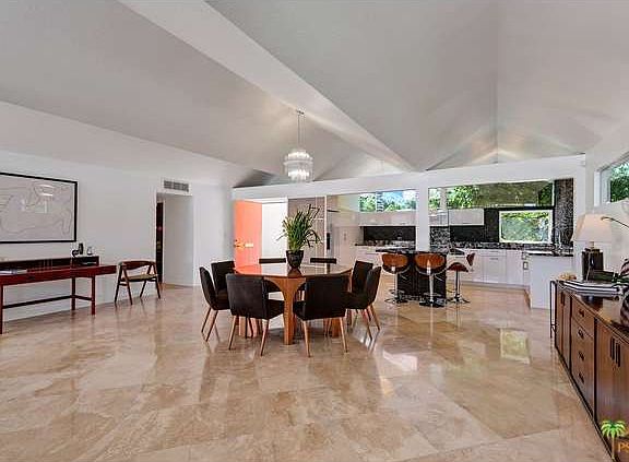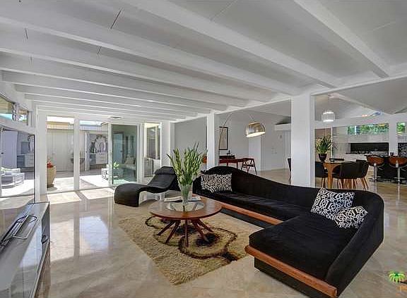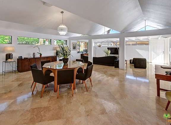 It was said of architect Barry Berkus that his designs were 'not for the faint of heart', but you'll swoon with joy when you see the passion built into this folded plate Las Palmas condo. Travertine flooring runs throughout this artfully restored home, with clerestory windows everywhere, providing views and a seamless transparency from indoors to outdoors, affirming the architect's vision. The kitchen has full walls of black river rock with Brazilian mosaic granite counters and European white high gloss cabinetry. All lighting fixtures are hand selected vintage originals. The master suite is bathed in sun or moonlight, and has an exquisitely tiled spa bath with glass enclosed Jacuzzi tub and glass vessel sinks. One guest room has double doors to the breeze-block enclosed,tiled patio that extends the living space, and the second bath with Japanese soaking tub has a modern Zen feel. The open living space, with folded and beamed ceiling,celebrates this triumph of Mid-century design.