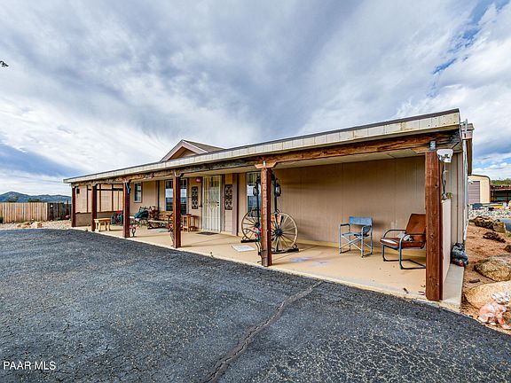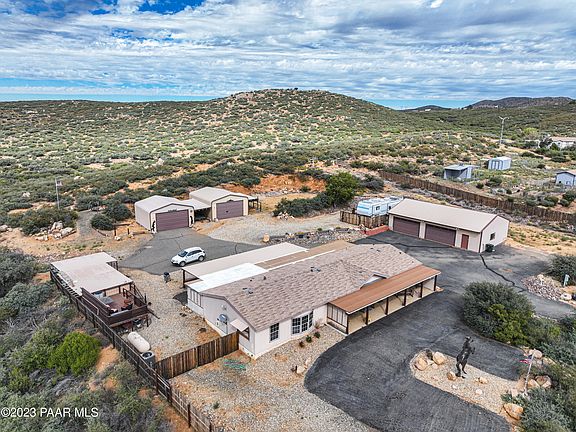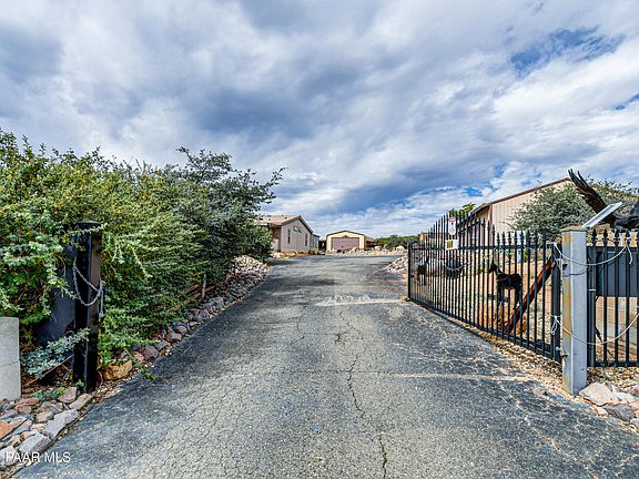 Hobby enthusiasts this is the one for you! You'll love this 2 acre property with garages galore! A total of 8 garages will allow you to have all the space you need for cars, toys, and workshop space. In addition to the garages you have plenty of parking with multiple carports and storage spaces. All paved driveway w/ gated property entrance. Space to build horse amenities as well. And the property borders BLM land! The 2005 built home is a spacious model with split floor plan. Large kitchen and living room area. A large front porch to relax and enjoy the views. Or entertain on your viewing deck of the Mingus Mtns! A bonus RV pad, w/ hookups and RV are included in the sale. Could be a nice 2nd living space for guests or other family!
