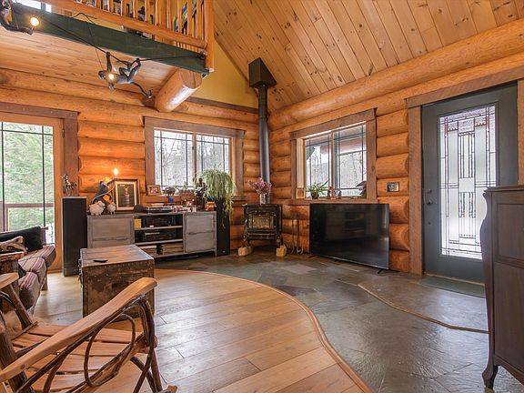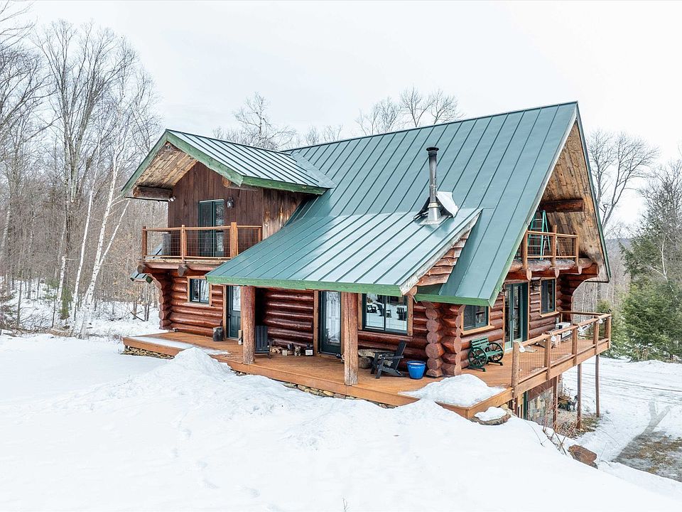 Exceptional log home privately set on 14+ wooded acres above a gentle, meandering stream adjoining the Green Mountain National Forest. This special retreat offers three spacious bedrooms, including a main-level primary suite, and two second-floor bedrooms with a shared full bath. The main level features a cozy, light-filled family room, a generous dining area with a coffee bar and a well-appointed kitchen with abundant cabinetry, storage, and breakfast bar. The main-floor laundry area and half bath complete this level. Step outside to the wraparound deck, accessible from the family room to the covered front porch and from the dining area to the side deck overlooking the stream. The second-level loft provides a comfortable living and entertaining space overlooking the main-floor family room, along with a built-in desk/workspace and an art studio area with slider access to a private deck overlooking the woods and stream. All three bedrooms enjoy deck access and peaceful views. The full unfinished basement offers a one-car, tuck-under garage and endless potential. Are you looking for a workshop area, exercise room, second kitchen, or additional living space? What’s your Vermont dream? Welcome home!!!