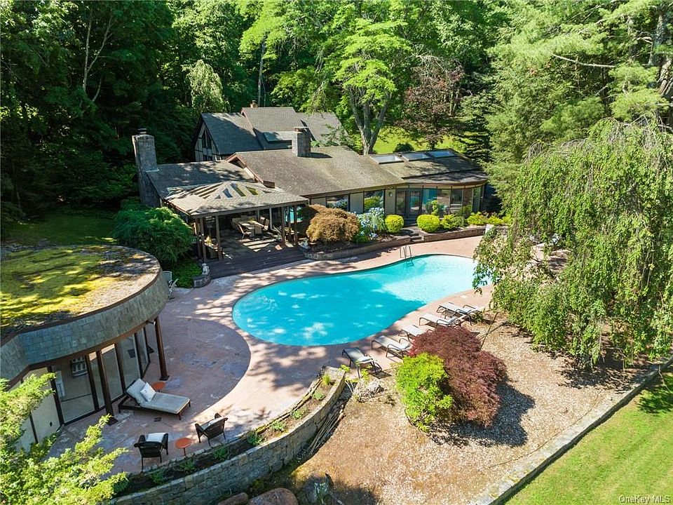 Stunning light filled mid-century modern architectural masterpiece features floor to ceiling windows, expansive views, pool/pool house, tennis ct, covered patio. Privately set on 3+ acres, close to town/train, w direct access to Valley Ln neighborhd. Curved walls, skylites, renov gorgeous Chef's kitchen w maple cabinetry/granite/ss counters /Top of Line SS Appliances, opens to brkfast rm w 4 skylights, open to Fam Rm w soaring beamed ceilings/FPL/SGD to pool/patio, LR/FPL & floor to ceiling windows. Gracious sep wing w oversized primary suite w curved glass floor to ceiling windows overlooking pool, dressing rm/huge WIC, newly renov Spa style Bth w exquisite finishes. 4 addt'l BR's, 3 addit'l full baths. Separate office area for all 5 BR's. New Powder Rm, Laundry Rm, Mud Rm entry & 3 car garage. Beautiful, peaceful serene views fr walls of windows throughout. If you're looking to be surrounded by beauty, & love to entertain indoors & out, this mini estate is for you! A must-see GEM.