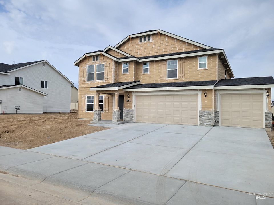 The Spruce with Heritage Elevation . The formal dining room features a butler’s pantry into the kitchen with Quartz countertops, Island, Stainless steel appliances including microwave, dishwasher and gas range. An open loft and Laundry room upstairs make this home a great choice. Photo is on Winter hold. This home is HERS and Energy Star rated with annual energy savings!