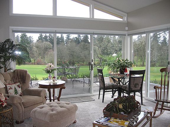 Contemporary single-level home on 6th fairway of Eugene Country Club. 220 degree panoramic golf course views. 1192 ft. of patio space. Open, light & bright home. Vaulted ceilings & skylights. Kitchen & family room with gas burning fireplace. New appliances: Jenn-Air and Sub-Zero. Walk in pantry. Master en-suite with large walk-in closet, built-ins, tub & walk-in shower. 2nd bedroom en-suite. Private side patio. Raised garden beds. 2 espaliered apple trees. Third bedroom/den with views. Big laundry/craft room. Oversize garage - basement with new expoxy coated floors.