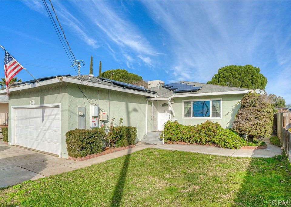 Spacious 4 Bedroom 2 Bath home. Interior has newer paint through out the home. Roomy open floor plan with laminate flooring in living room. Many cabinets, newer counter tops and stainless steel appliances. Dining area opens to kitchen and living room. Laundry room with washer and dryer, Cabinets and sink. Newer carpet in 3 of the bedrooms. Hall bathroom has a shower and jet tub combo. Master bath has a large tile shower with 2 seats and 2 shower heads. Electric bills is low with solar. On demand water heater. Fenced yards. Covered back patio. Shed could be for storage or workshop. Garden area and play area. Very clean well kept home.