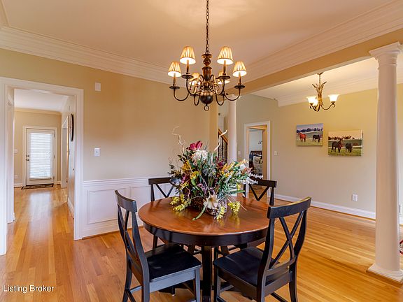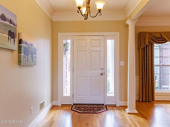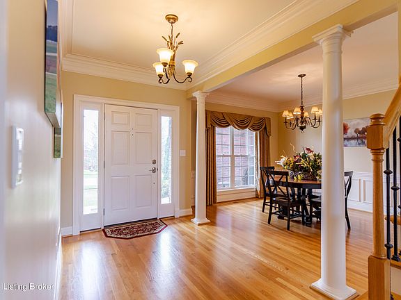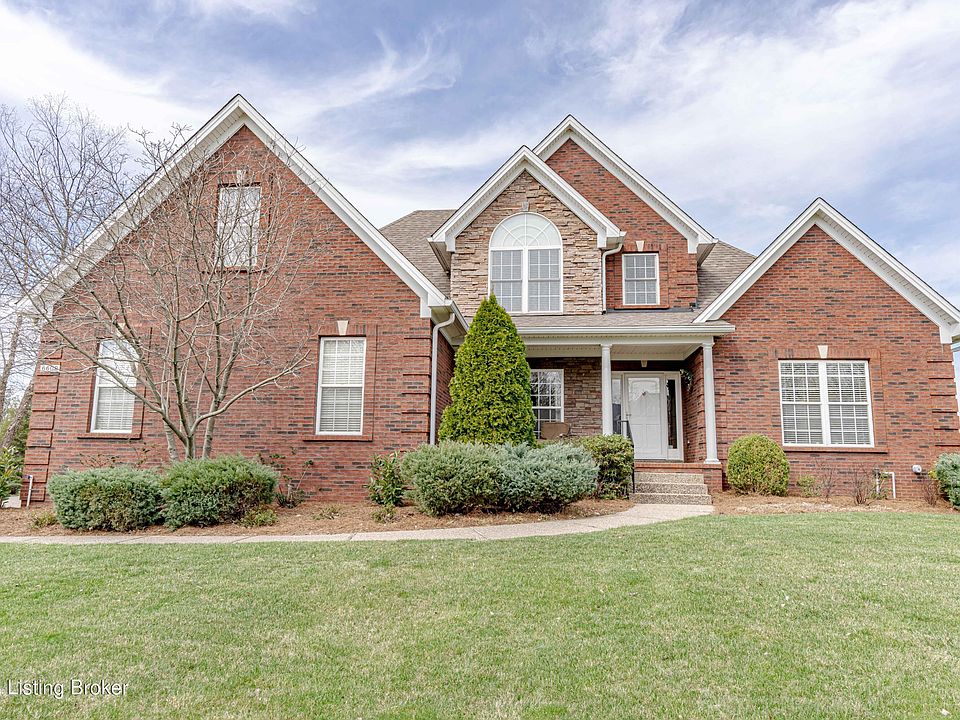 Spacious with very functional floor plan! 4 bed, 3.5 baths, first floor primary bedroom, side entry garage, large basement with 8 ft ceilings and, nice corner lot that is almost half acre in a desirable neighborhood close to award winning Oldham County Schools. Covered front porch leads to foyer, formal dining room, great room with soaring 2 story ceiling that opens to large Eat-in Kitchen with center island. Beautifully maintained hardwood floors and lots of crown molding. Private primary suite with trey ceilings. Spacious primary bath with dual vanity, tile floors, tub, shower and large walk-in closet. 2nd level offers 3 spacious bedrooms, one with its own private full bath and a Jack and Jill bath between to others. Basement is open, with painted walls and carpeted. Roof and HVAC updated, Nicely landscaped, irrigation system, extended patio and driveway, shows great! Great location! Seller is offering a limited 1-year Cinch Home Warranty valued at $572.