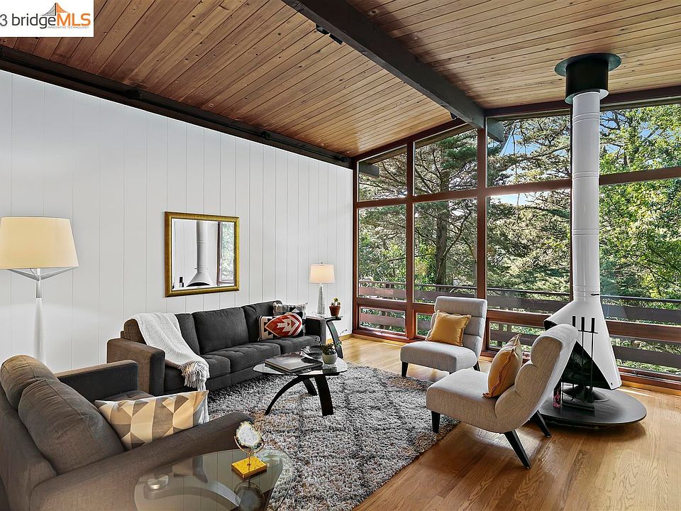 This warm and welcoming home has it all, from classic California style to flexibility: The best of mid-century, nature-loving architecture as well as a complete apartment with separate entrance. Walls of windows under exposed wood butterfly ceilings unify its design. Glass doors open onto private decks, clerestory windows invite the light in, updated kitchen opens to dining and living spaces. Hardwood floors, fireplace, Viking range. Congenial lower level with new kitchen and full bath, walk-in closet, fireplace and bonus room with blackboard wall plus nook and extra storage. 6600 sits at the end of Evergreen above Moore Drive. Adjacent undeveloped land provides extra privacy. Utility/laundry room/workshop tucked under two vehicle garage. Interior stairs link or separate the home’s two levels for a total of 2165* square feet of living space. Compliant sewer lateral, all reports completed and included in disclosures. Proximate to thousands of acres of East Bay Regional Parks District’s Sibley, Roberts, Huckleberry and Redwood Regional parkland. Montclair Village shopping and services, AC Transit links.