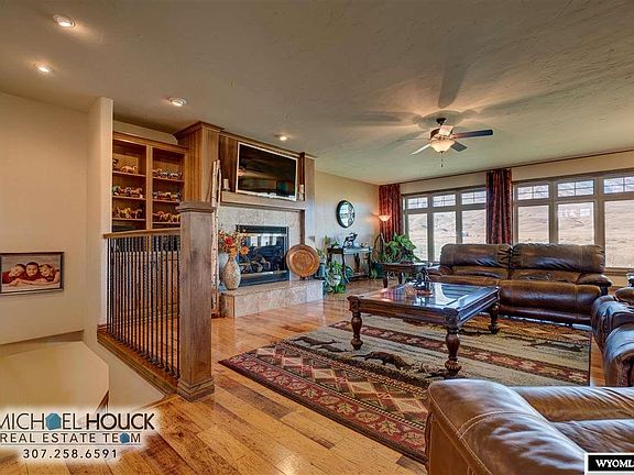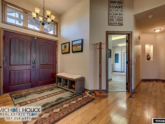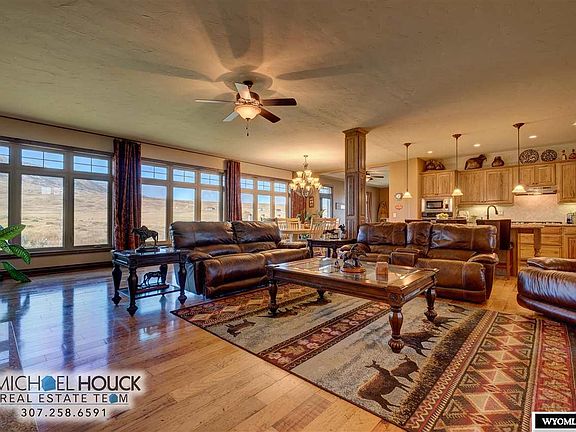 Wyoming Paradise! This stunning 20 acre country property features a 5700 square foot home with 5 bedrooms, 3.5 baths, gourmet kitchen, walk out basement, 2 bar areas for entertaining, fire place and pellet stove, custom tile and stone work, raised ceilings, and views from EVERY window! Exterior features a private well, Two 40 by 60 heated shops, a loafing shed (Bring your horses) and a creek running through the property that owners have enjoyed fishing from for years! The best Wyoming has to offer!