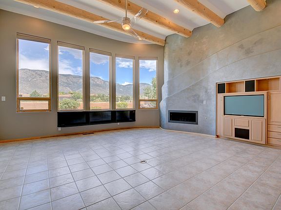 AMAZING VIEWS OF THE SANDIA MOUNTAINS. Enter into this unique home full of colors and personality. The sweeping fireplace and large windows accent the views of the open space behind the house and views! Stunning kitchen with custom storage, turquoise glass accents, warming tray, pull out pantry wire racks, cork flooring and a warming tray and black quartz island. Living, dining area has wonderful windows and french doors to the covered patio. Separate primary bedroom with mountain views and updated bath suite. Second bedroom boast of a new york skyline. 3rd bedroom was a jewelry making office with peg board on 3 walls and built in desk and storage. Front office is amazing. Bookcases and designer walls! This whole house is a work of art.