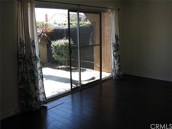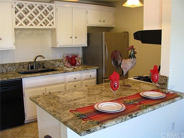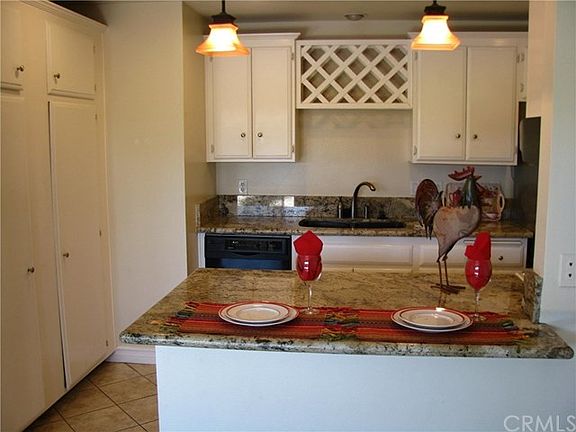 Great location in the last building in the back of the complex furthest away from Warner. Beautiful downstairs unit with 1 bedroom 1 bath. There are 2 parking spaces and very rare this unit has its own washer and dryer included in the sale. The kitchen has been remodeled with granite counters and stainless steel refrigerator which is included also. Beautiful hand scrapped hardwood floors in living room. Newer laminate wood in the bedroom. Lots of closet space in the master. The bath has been remodeled with with a soaking tub, dual shower heads and stone surround. Upgraded moulding, large slider to patio, this is a must see. HOA includes gas, water, trash, pool, spa, and fitness room. No land lease and secure gated community.