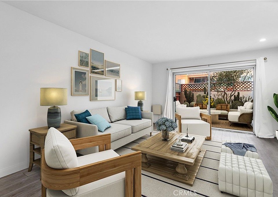 Beautiful lower-level one-bedroom condo with a private backyard in the lovely gated community of Villa Warner! Enter into your spacious and bright living area, featuring a sliding glass door to the backyard. The home features an updated kitchen with a ceiling fan, recessed lighting, stainless steel appliances, white cabinets, and countertops are poured concrete with a wood laminate butchers block section. The bedroom overlooks the private patio and features a closet. The hallway offers additional double closets. The bathroom has a new vanity with corian counters. The backyard is perfect for entertaining, barbecuing, or relaxing in your private garden. This unit includes two parking spaces. Villa Warner is a highly sought-after, dog-friendly community offering a large pool, sauna, gym/weight room, clubhouse, billiards room, BBQ areas, and extra storage, all within a gated environment. The complex is centrally located, close to shopping, restaurants, schools, freeways, and parks, and just a short drive from the beach. This unique unit, with its rare TWO parking spaces, is VA and FHA approved, with low HOA dues. Don’t miss out, come see it today!