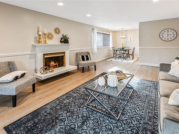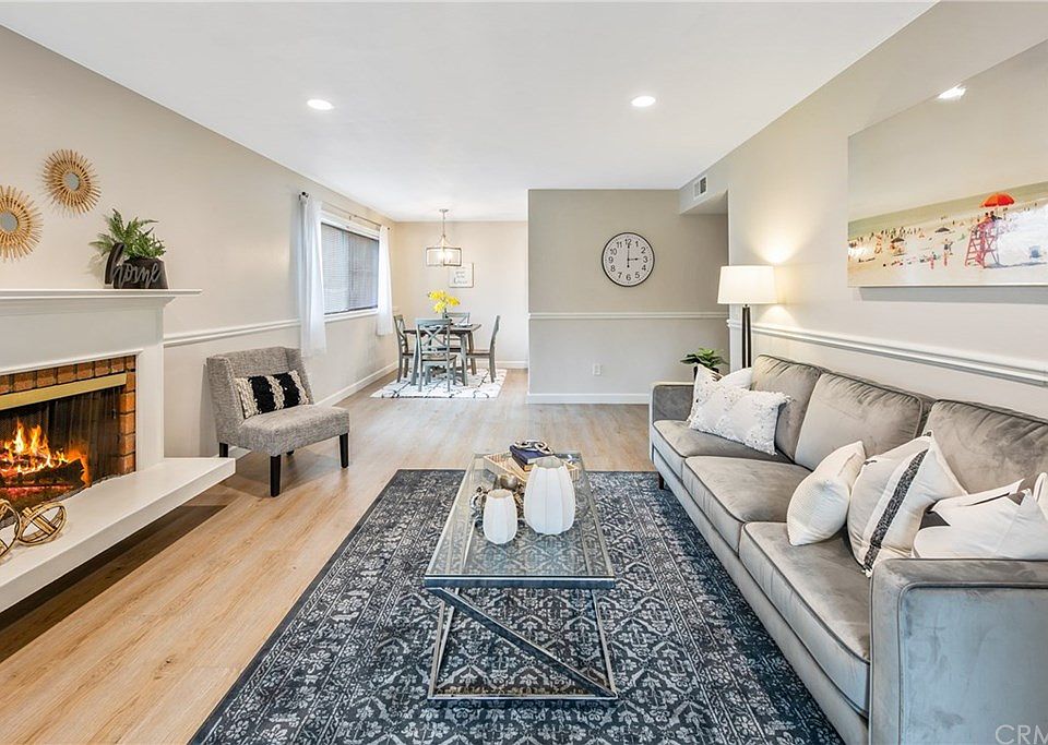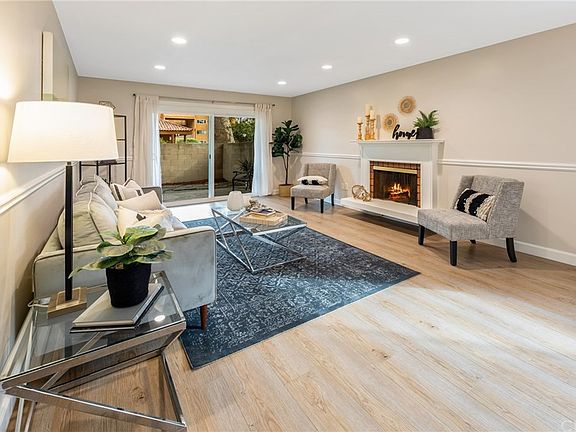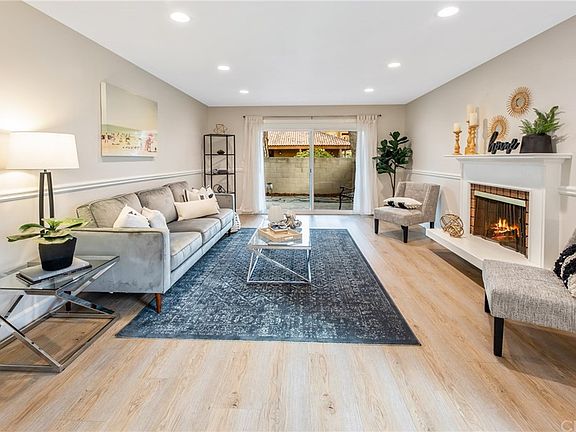 Now is your opportunity to own this beautiful, 2-bedroom, 2 bathroom condo in Villa Warner of Huntington Beach! With 1100 sq ft of living space, this lower-level end unit offers ample space to entertain with a large backyard and patio area overlooking the community courtyard and pool. This lovely home is move-in ready and has been recently upgraded with vinyl plank flooring, fresh paint, and recessed lighting. Enjoy cooking in the light and bright kitchen, featuring brand new stainless steel appliances, refrigerator/freezer, and plenty of cabinet and pantry space for all your organizing needs. Spend cozy evenings gathered around the fireplace or BBQing out on the patio. The large master bedroom boasts two large closets with built-in shelving and an upgraded bathroom with a tub in shower combination. The guest bathroom includes tile flooring, new vanity, and ample storage space with floor-to-ceiling cabinets. This pet-friendly, gated community includes plenty of amenities, including a large swimming pool, jacuzzi, outdoor BBQ area, clubhouse with billiards, gym, & laundry; water, gas, and trash utilities are included in the HOA dues! Last but not least, this home includes TWO parking spots, one of which is located just outside the unit for easy access as you come and go throughout the day. Located just minutes away from the beach, great schools, freeway access, and Bella Terra shopping...this Villa Warner home is a rare find & won't last long!