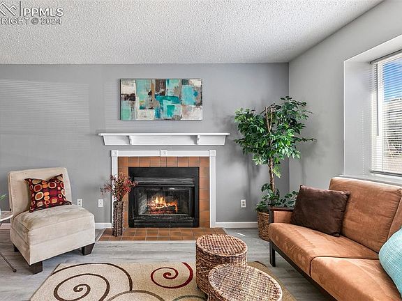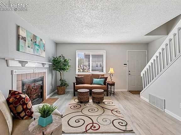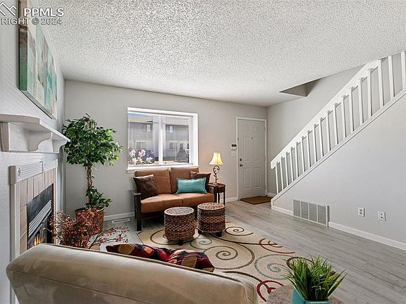 This townhome community is nestled away in a quiet neighborhod, yet still close to the Powers and Marksheffel corridors offering easy access to excellent dining, shopping and entertainment options, making it perfect for both convenient commuting and enjoying local amenities. Step inside to discover a nicely designed floor plan that features open-concept living, kitchen, and dining areas. The main level boasts a convenient bath, a cozy living room with a wood-burning fireplace, and a dining room that walks out to a rear patio. The kitchen is equipped with stainless steel appliances and a window that overlooks the green space in the rear. The back patio, enclosed with privacy fencing, includes a well-sized storage closet and direct access to the community green areas through a gate. Head upstairs to find two comfortable bedrooms, a full-sized bathroom with updated tile and a tub/shower combination, and a laundry closet with included appliances. This well-maintained property is move-in ready, featuring low-maintenance luxury vinyl plank flooring on the main level and soft carpeting throughout the upstairs. With plenty of windows, this light and bright home is waiting to welcome you.