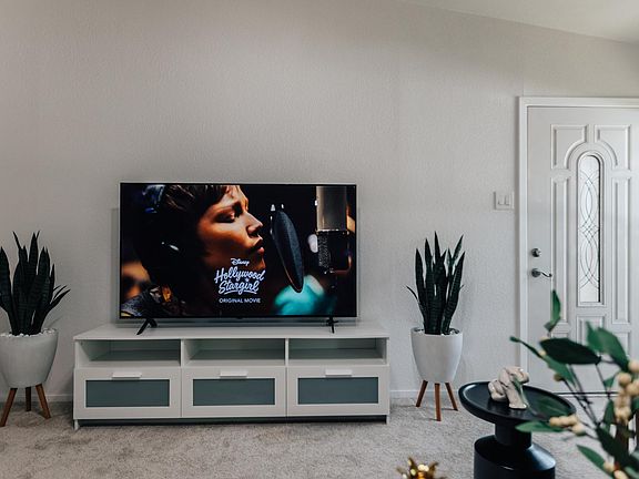 Inviting Living Room Relax with a 65-inch smart TV, a cozy electric fireplace, and a comfortable sofa set perfect for movie nights or family time.