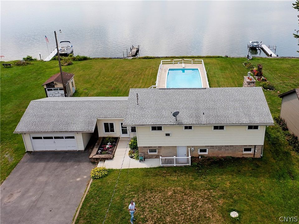 Charming lake front home on 100 feet of level frontage on Cayuga Lake. The home offers an open floor plan with, vaulted ceilings in the living room, gas fireplace, three ample bedrooms, sunporch overlooking the water, deck with pool, nice sized yard, attached garage, and partial finished lower level basement. Enjoy lake living and your minutes to vineyards and a world class spa in Aurora.