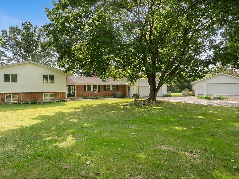 This stunning, fully renovated home offers over 2,600 sq. ft. of finished space, featuring 4 bedrooms and 3.5 bathrooms. Enter through elegant double glass front doors into a welcoming entryway that leads to an open-plan living area. The eat-in kitchen boasts custom cabinetry, granite countertops, black appliances, and a spacious island with seating. Enjoy cozy evenings by the gas fireplaces in both the living room and lower-level family room with exterior access to the patio. A heated 4-season room, conveniently located off the garage and kitchen, provides year-round comfort. The master bedroom includes a private deck with serene views. Main floor amenities include a mud room and a newly added half bathroom. Nestled on 2.44 acres, this property features a pond perfect for swimming, boating, and fishing, with mature blue spruce and pine trees adding to the natural beauty. The home underwent a complete renovation in 2021, including new doors, four front windows, flooring updates, and a new deck off the kitchen. The property also includes an attached 2.5-car garage and a detached 3.5-car garage/outbuilding. Located close to I-90, shopping, and more, this home is a perfect blend of comfort and convenience.
