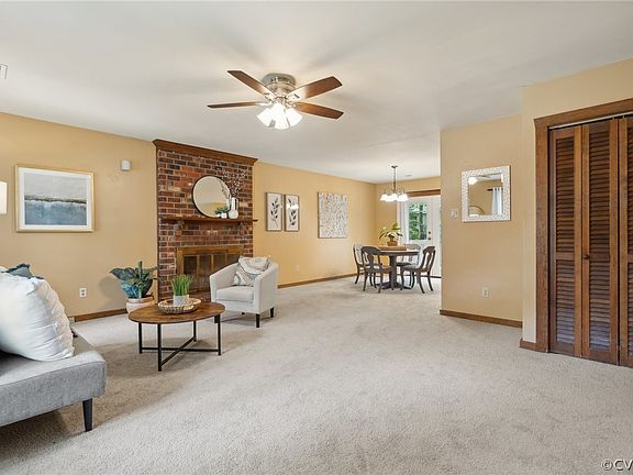 Upon entering, you step into the newly carpeted, expansive living room with a cozy wood-burning fireplace. The living room flows seamlessly into the dining area and kitchen, complete with an eat-at peninsula for casual dining. Down the main hallway, you’ll find a full bathroom and three inviting bedrooms. The primary bedroom, featuring two large closets, includes a private half bathroom.