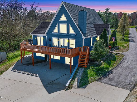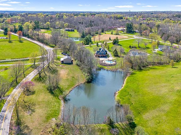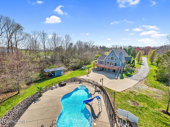 Wake up to the picturesque beauty of one of the finest views in Oldham County every morning! This magical oasis is a custom built, three level A-Frame home with over 3,400 sq. ft of living space to ensure everyone has plenty of space to unwind. It is truly one of a kind for families that are looking for a tranquil setting on over 5 acres with a luxurious in-ground swimming pool that looks over a glorious one acre pond surrounded by spectacular trees. The moment you walk in you will be captivated by the soaring ceilings in the great room with an amazing triangle wall of windows overlooking your incredible views. Complete with Creekstone fireplace and real hardwood floors. Open to the dining area, which is ideal for large family meal gatherings & has fantastic window views. The kitchen is complete with high end stainless steel appliances including a pantry, cherry cabinetry and plenty of counter space. All of this that walks out to the grandiose composite deck that is perfect for grilling out and your morning cup of coffee. On the first floor you will also find 2 nice size bedrooms with double closets and a full bath complete with walk-in shower and large jacuzzi tub. Upstairs, you will find the owners suite which includes a large bedroom with vaulted ceilings. The primary ensuite has a large walk-in shower and modern updates. Completing the owners suite is a full loft area that overlooks the great room and the views are incredible. This would be an ideal location for an office area that is guaranteed to make your day less stressful. The basement level walks out to a huge patio area and provides so many options & would be great for multi-generational families. Complete with huge family room, (2) kitchenette/bar areas, 2 additional bedrooms, a full bathroom, a 1/2 bathroom and a laundry area. All of this features wonderful windows and separate entrances for kids as they grow older or in-law quarters. This home adapts to your family's needs effortlessly. Immerse yourself in the outdoor space that really completes this package of a forever home. In-ground swimming pool complete with a slide, serene 1 acre pond and a KY Barn outbuilding atop the hill offer endless opportunities for outdoor enjoyment. Splashing in the pool, casting a fishing line into the pond, and exploring the nearby creek which provides just the perfect sound of rainwater skimming the rocks after a refreshing rainstorm. Storage is no issue with two convenient outbuildings, including a 30x40 spacious pole barn with room for all your recreational and farm toys. From motorhomes to boats to mowers, everything has its place, leaving you more time to savor the idyllic surroundings. For 18 years, this home has been the heart of cherished family memories from ice skating on the pond to lazy afternoons by the pool. Now, it's time for a new family to create their own treasured moments in this one-of-a-kind oasis. Don't miss the chance to make this extraordinary property yours and start living the vacation lifestyle every day!