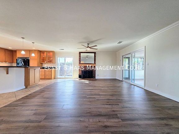 The fully remodeled kitchen includes a huge breakfast bar, pendant lighting, quartz countertops, and comes equipped with a stove, oven, dishwasher, refrigerator, and microwave. A semi-circular hallway connects all three bedrooms, along with a large walk-in closet offering excellent extra storage. The primary bedroom features an ensuite bathroom and direct access to the garage. The two additional bedrooms are nicely sized and share a well-appointed hallway bathroom. All bedrooms include large wardrobe closets and ceiling fans.
