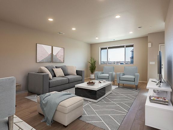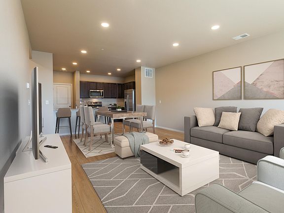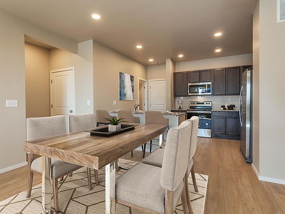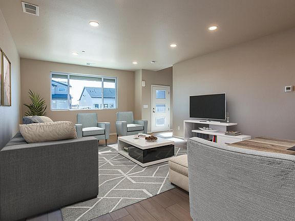 The Ouray floor plan is an interior unit townhome featuring an open concept main-floor with eat-in kitchen island, walk-in pantry, and half bath. The second floor consists of 3 bedrooms with walk-in closets and two full bathrooms as well as a dedicated laundry room.