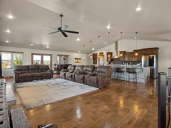 Listed by Jeremy Kahler, KWBH, 605-381-7500. Nestled in the upscale Red Rock Estates community, this beautiful home combines quality construction with quiet luxury into a truly MUST SEE property! *5 bedrooms, 3 bathrooms and a staggering 4,076sqft *The spacious entryway welcomes you in, with 12' ceilings that guide you up to the open concept main living space *An uninterrupted layout blends living and dining space together, making entertaining a breeze *The oversized great room has beautiful wood floors, vaulted ceilings and is anchored by an impressive gas fireplace with stacked stone surround with built in entertainment alcoves and an art feature space above *The incredible kitchen is the heart of this home, centered around a 20' island with bar seating for 8, and gorgeous Blue Roma quartzite waterfall countertops, custom Alder cabinetry, built in stainless steel appliances (including brand new double ovens!) and a walk in pantry *Formal dining area with window overlooking the front yard *Main floor laundry room allows for easy one-level living *Private primary suite with a spacious bedroom, and a spa like ensuite bathroom with whirlpool tub, a tiled walk-in shower, double sinks and large walk in closet *2 additional bedrooms and 1 full bathroom complete this level *Wooden staircase leads downstairs to the fully finished walkout basement offering 9' ceilings, an oversized family room, 2 good sized bedrooms with walk in closets, 1 full bathroom and great storage space
