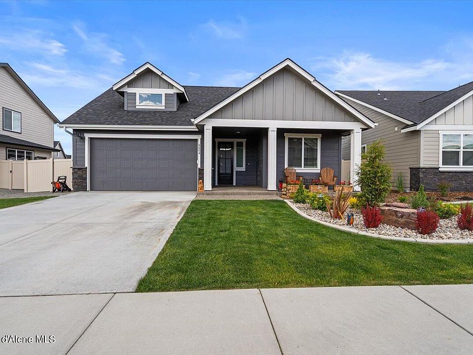 Beautiful, one-level, 3bdrm, 2bath home at The Trails! Built in August, 2022. Open floor plan, oversized great room w/vaulted ceiling, 9 ft ceiling heights, 8 ft door heights, gas (stone) fireplace. Lots of natural light! Gourmet Kitchen with stainless gas appliances, soft close cabinetry, solid surface quartz counters, farm sink, & full height backsplash. LARGE ISLAND, & pantry. Luxury plank flooring throughout most of the home & closets. A/C, privacy glass in front door & side window as well as above main bath shower, OVERSIZED BACK PATIO, front & back yard landscaping, back yard is fully fenced w/vinyl fencing, Front & back yard sprinkler system. Neighborhood & partial mountain view. Minutes to retail, shopping & downtown Coeur d'Alene.