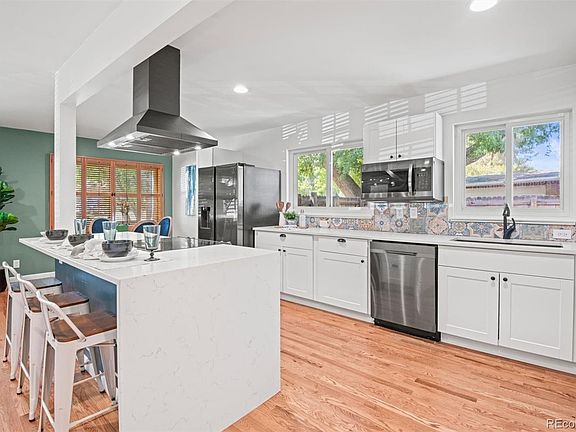 Location and convenience shine at this beautiful open concept ranch minutes from Olde Town Arvada! This move in ready home boasts natural light, fresh paint, and open concept main living. Quartz counters, stainless steel appliances, and a large breakfast bar make the main level perfect for hanging out and entertaining. 2 sizeable bedrooms share a full bathroom on the main level, and the primary suite is quietly tucked back and features a beautifully updated primary bathroom. Previous owners moved the laundry to the main level, and newer washer & dryer are included. The big finished basement is perfect for an entertainment room, play room, pool room, or all of the above! Two more conforming bedrooms, another 3/4 bath, and a flex space for storage or an office round out the spacious basement. Take a step out to the newly updated outdoor space featuring a fire pit, spacious patio perfect for games and grilling season, and has been beautifully xeroscaped to save on those pesky water bills. New roof in 2021, new sewer line in 2022. Secrest Rec Center is 3 blocks away complete with great grass fields, playgrounds, a great pool, and year round gym and rec center. Looking for a night out? Shops & Boutiques? A cold beer? All of this is within a 5 minute drive to Olde Town Arvada! Yes, this also means the lightrail is 5 minutes away too if you want to head downtown and avoid traffic and parking. If you're looking for turnkey and convenient, schedule your showing today!