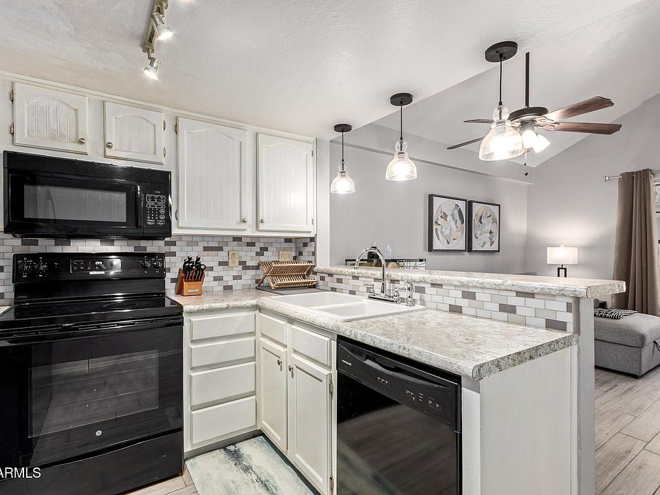 Stunning end unit townhome is a delightful 1-bedroom, 1-bath retreat designed for both relaxation and style. As you step inside, you'll be greeted by a light-filled living space featuring vaulted ceilings that create an airy ambiance, and gorgeous wood grain tile that flows seamlessly throughout the home. The kitchen is complete with a chic tile backsplash that adds a touch of sophistication, extensive storage for all your kitchen essentials, and stylish pendant and track lighting that sets the mood for every occasion. Whether you're whipping up a quick breakfast or hosting friends for dinner, this space is ready for it all! Rest easy in the cozy bedroom, where plush carpet adds... warmth, making it the perfect sanctuary after a long day. And don't miss the beautifully updated bathroom, featuring a sleek subway tile shower, modern lighting, and a stylish vanity. Step outside to your tastefully decorated patio space, offering direct access from the master bedroom. It's the ideal spot for your morning coffee or an evening unwind. Plus, you have the bonus of a convenient inside stackable washer and dryer, making laundry day a breeze. But wait, there's more! Enjoy sunny afternoons by the community pool or take a stroll in the grassy area right outside your door. This vibrant community offers relaxation and recreation at your fingertips. Don't miss your chance to call this gem home, tour today and experience the perfect blend of style, comfort, and fun living! *HOA fees include your water!*