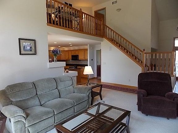 Custom Contemporary 4 bedroom, 1.5 story located in River Meadows sub-division offers spacious main floor with well appointed kitchen w/breakfast bar, dinette, and pantry. Also on 1st floor is MBR w/large BA, & WIC, great room, cathedral ceilings, NFP, dining room,& laundry. Second floor offers loft, 2 BRs, and full bath. Finished basement has family room, fitness center & additional space for office & bath. Manicured yard and landscaping surrounds private patio.