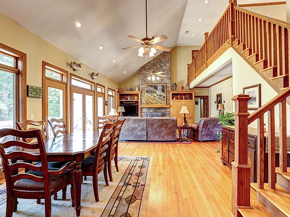 Large custom lake home with level driveway on deep water. This gorgeous and unique floor plan features an expansive and open main floor w/ hardwoods, great room, master on main. The huge master is complete with fireplace, sitting area and HIS & HER BATHS and closets. Upstairs you will find a loft area, 2 guest rooms & bath. The finished basement leaves endless opportunity with large rooms & full bath. The entire back of house is decking overlooking the stone patio, fireplace/grill. Walk or ride down to the double/covered dock. Custom upgrades such as home generator etc!