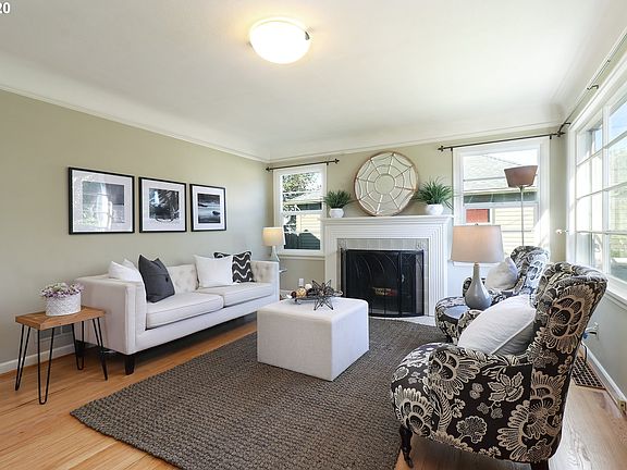 Lovely Home Nestled on Quiet Street of Arbor Lodge. Enter to hardwood flooring and light filled living. Wood-burning fireplace. Kitchen features quality appliances and granite-tile counters that open to dining space. 2 generous bedrooms and beautifully tiled full bath on main. Large upper room as primary bedroom. Spacious, tall ceiling laundry/storage down along w bonus room. Very private sunny fenced backyard and detached garage. Street ends at Arbor Lodge Park. See v/tour for more info! [Home Energy Score = 5. HES Report at https://rpt.greenbuildingregistry.com/hes/OR10187468]