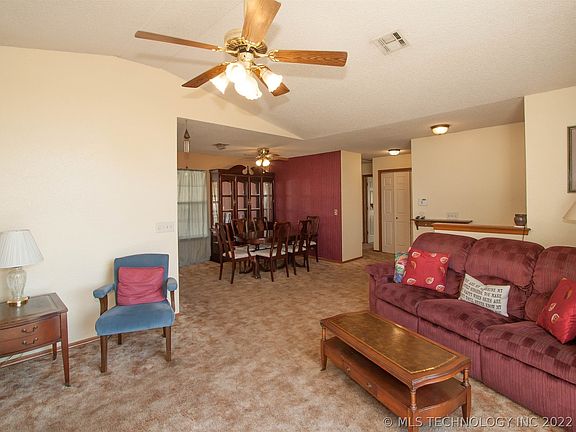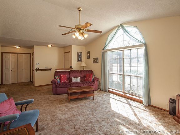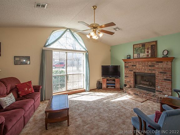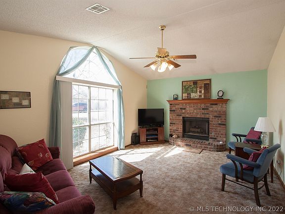 This nice 1-owner home in Fairway Park addn sits on a corner lot of a cul-de-sac. Page Belcher golf course surrounds the neighborhood. PSO certified energy efficient/tested. New programmable HVAC in 2018 w/transferable warranty. New storm door 2016. Minor updates in kitch & both baths. New stove & dishwasher. Freshly painted liv room, hallway. Ceiling fans in Liv rm, dining & all bedrms. Cov patio & 10x12 shed. Home wired for security system. Jenks schools. Close to Tulsa Hills shopping & W Highlands Park