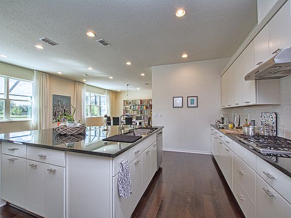 Are you looking for modern, sleek and contemporary? Look no further. This beautiful home is stylishly upgraded with top of the line builder upgrades to include a large number of recess lights and 220V outlets, as well a stunning modern kitchen with ample amounts of cabinets and a very large island/breakfast bar. The contemporary feel extends all thru the house with mostly a light color scheme. Even the solar heated salt water pool and deck area were built to retain the same clean and sleek feeling. This home is perfect for entertaining as it provides a truly open and airy space with plenty of sunlight and wonderful dark and warm engineered wood floors. 3 bedrooms, to include the master suite are upstairs. A good sized loft with a walk-in closet for storage, greet you when you get to the 2nd floor. A large laundry room is also conveniently located upstairs. One of the bedrooms and a full bath are situated downstairs to accommodate your guests and this bedroom is currently used as an office. Enjoy your evenings on the extended screened patio with a westerly view of the sunset over the 2 ponds and peaceful conservation area behind the house. Natural gas supplies your kitchen stove as well as your BBQ area. There is ample storage in this well designed floor plan, even additional garage storage was added. The Epoxy garage floor impresses. A security system with several cameras was installed to give you added piece of mind. Situated close to schools, shopping and easy commute to the interstate system.