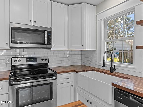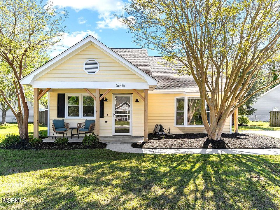 Are you looking for a charmingly renovated and move-in ready home close to Mayfaire and Wrightsville Beach? Welcome home! This gem has all the updates you could hope for! The living room with vaulted ceiling is open to the kitchen for perfect entertaining space. The chef's kitchen is newly renovated with stainless steel appliances, shaker cabinets, butcher block countertops, farmhouse sink, mobile prep island, new tile floors, and gorgeous bay window with bench seat for the perfect eat-in breakfast nook. Upgraded features include LVP & engineered hardwood floors, updated bathrooms, new HVAC unit, newer roof, and newer hot water heater. Need storage options? This home has a new 8x12 detached shed, a smaller attached storage room, and covered storage shelves perfect for the gardener. Want plenty of outdoor and entertaining space? This home has an oversized lot, a fully fenced backyard, backyard patio & firepit, and rocking chair front porch. Weatherwood is a desirable neighborhood with easy access to Market Street, the new bypass, and Mayfaire area restaurants and shopping!