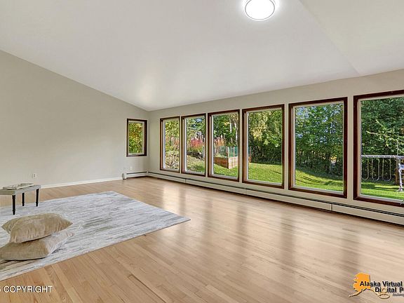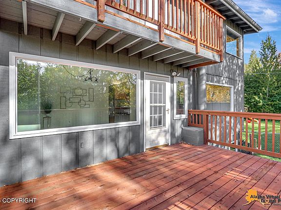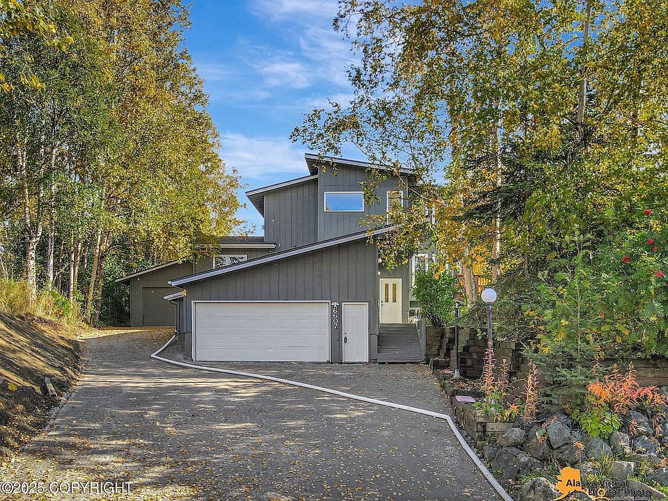 Seasonal 180 degree views of Chugach Mtns, yet treed and private in the summer months. Perched on top of the hill with loads of sunshine beaming through all the windows. MIL 2 Bedroom, 1 bath with full kitchen on the lower level of the home w/ private entrance. This home has had a major update including new roof, large deck on the south side of home, new driveway to 3 car garages, new exteriorand total interior paint, new flooring on all three levels with carpeting and LVP Tile floors, newer light fixtures, and some windows replaced. Refinished hardwood floors in the expansive sized living room. There is possibility of dual primary suites, one on main level of home and one on top floor. The two car garage attached is heated, there is another one car garage that is unheated and no sheetrock on the north side of the home. New energy efficient furnace. Located just minutes from the Airport and Kincaid Park, this location offers so much easy access to all locations of Anchorage. There are raised garden beds, a huge swing set, and extra storage sheds, 98% of yard is fenced. firepit, Come take a look - still opportunity to add your own design style to the home. All of the expensive items of the home have been replaced!
