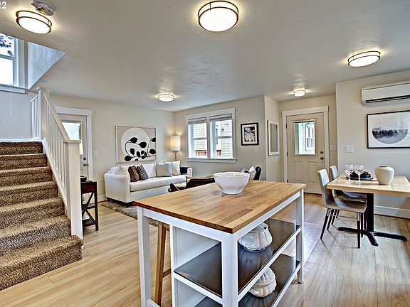 Gorgeous detached Condo with a perfectly livable floor plan. 2 bedrooms, 1.5 baths. Great room on main floor with built-in dining table, two good sized bedrooms upstairs, tons of storage and three mini-split units for low cost heat and AC. Stackable washer/dryer upstairs. Private fenced yard with a deck, separate storage shed & privacy. truly thoughtful design and craftsmanship in construction. 1/2 block to Peninsula park & transit. Just blocks to New Seasons Market [Home Energy Score = 10. HES Report at https://rpt.greenbuildingregistry.com/hes/OR10203106]